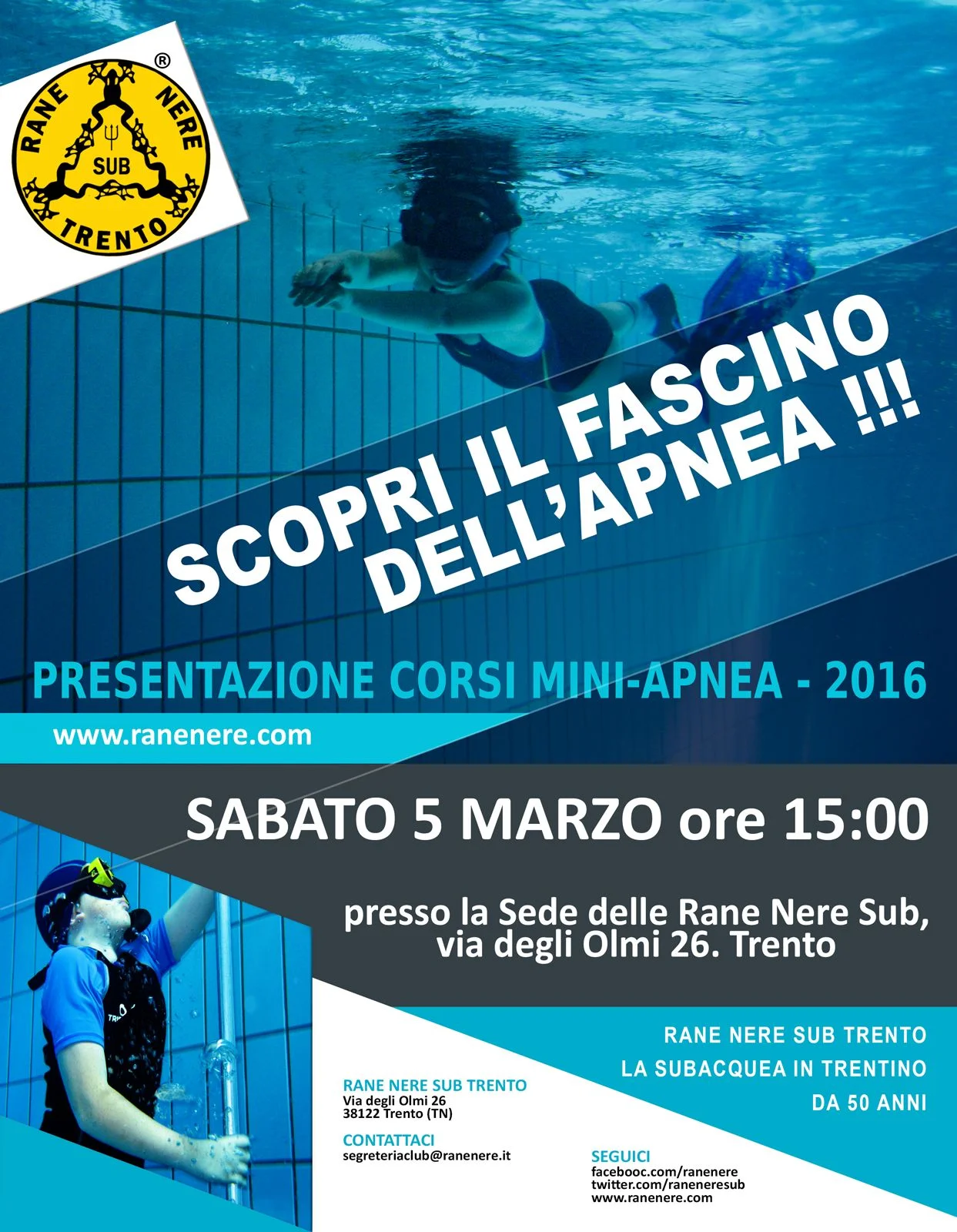Sede Rane Nere (map) Viale degli Olmi 26 Trento, Trentino-Alto Adige, 38123 Italy ✚ gCal ✚ iCal Anche quest'anno tornano i corsi di miniapnea per i bambini dagli 8 ai 12 anni, sabato 5 marzo alle 15.00 la presentazione, sabato 12 marzo l'inizio del corso. Per maggiori informazioni scrivete a segreteriaclub@ranenere.it.